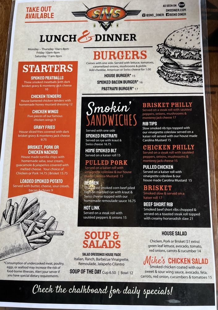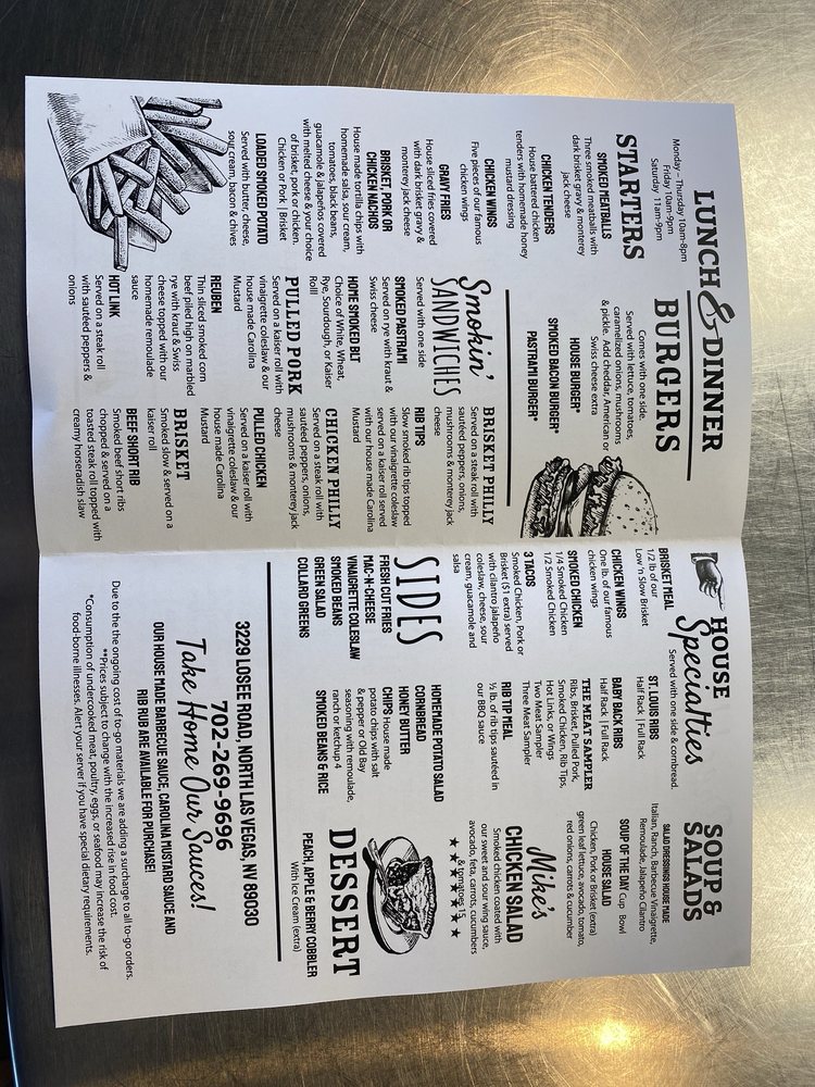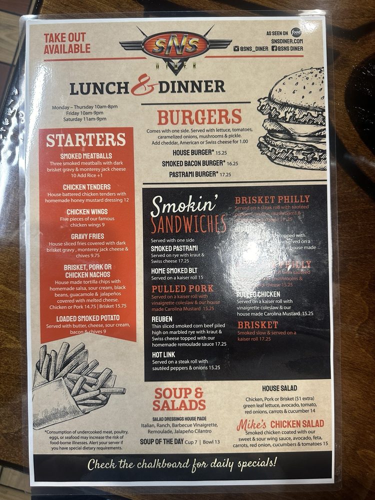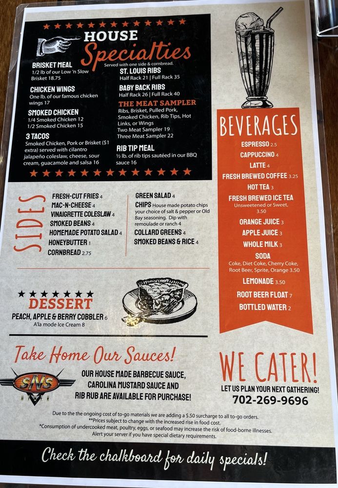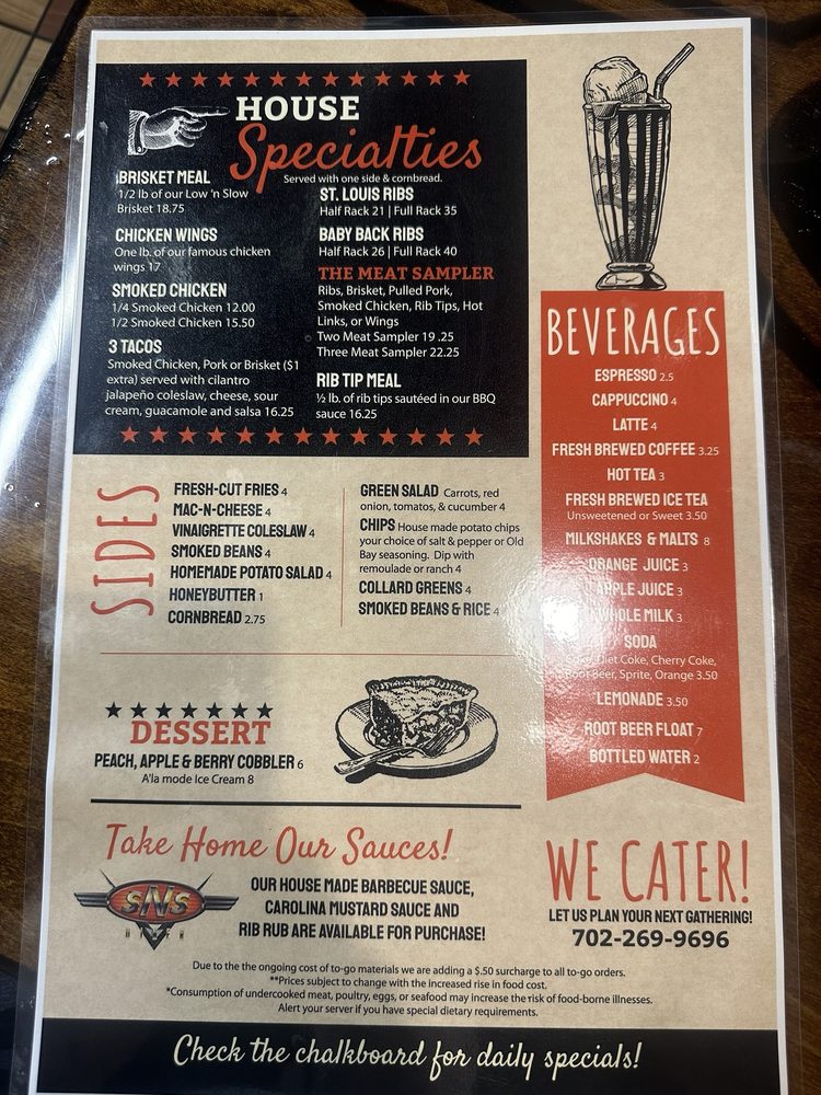 Welcome to SNS Diner BBQ, a gem nestled in North Las Vegas, where casual dining meets authentic barbecue bliss. The menu features a mouthwatering selection that pays homage to classic BBQ staples. Highlights include the three meat sampler showcasing tender brisket, succulent wings, and zingy hot links—all complemented by sides like rich mac and cheese and flavorful cornbread.
